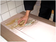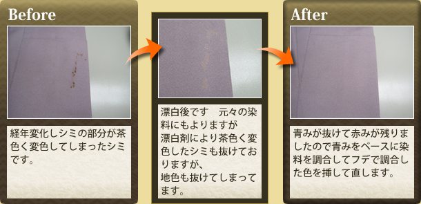 「地直し」とは、着物についたシミが経年変化で生地を茶色や黄色に変色してしまった古いシミの部分を補正するためにまず、漂白剤でシミ抜きを行い、