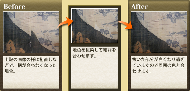 頑固なシミや、シミにより着物の生地が弱ってる場合などはムリな漂白作業を繰り返すのではなく、 シミの上に柄を書き足して自然な仕上がりに蘇らせます。