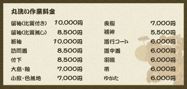 丸洗いは着物のメーカーや地域、店舗により生洗・絹衣洗・ドライ・丸洗いなど様々な名称がありますが、基本的に有機溶剤を用いた洗い方を言います。